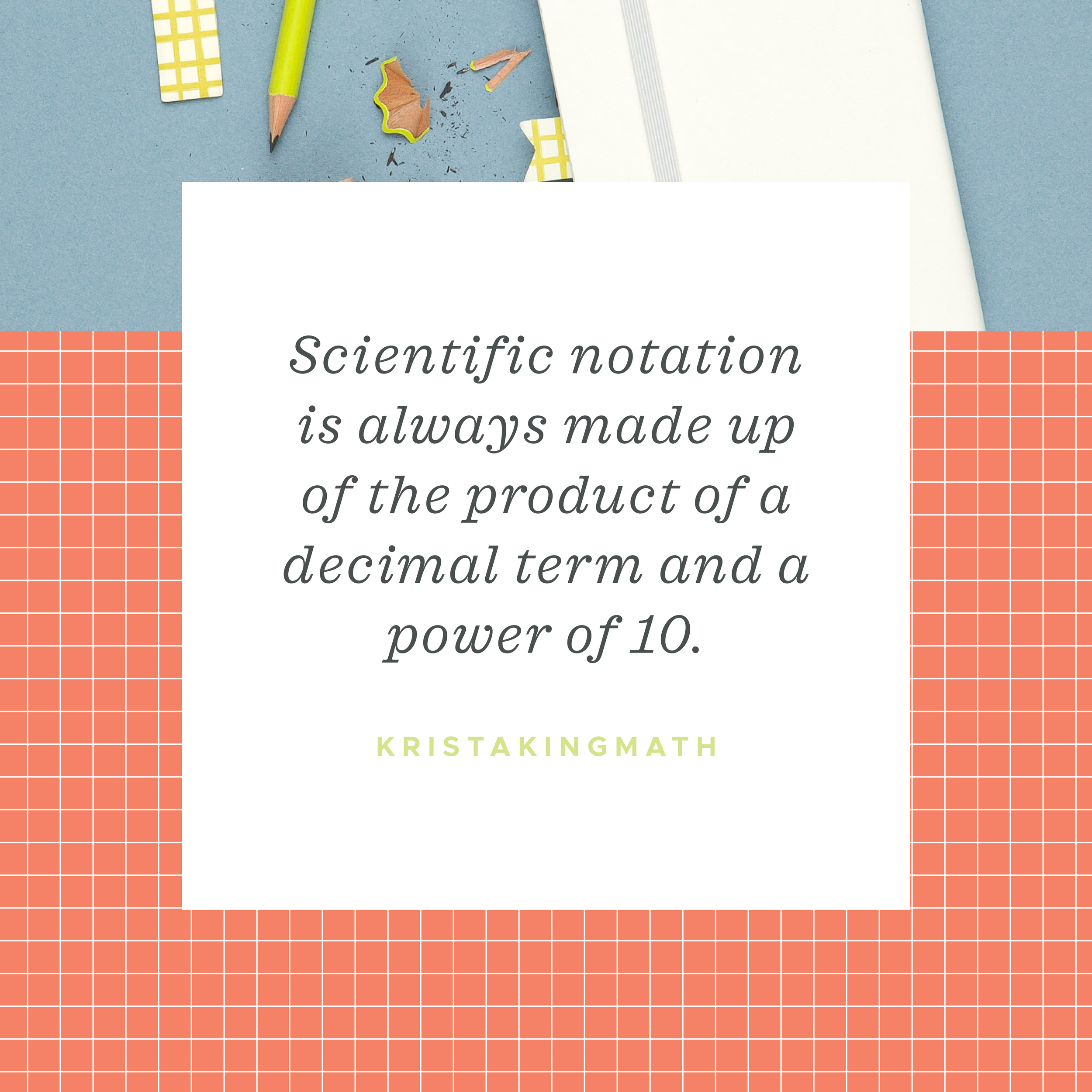 Scientific notation is all about proper form. There’s only format that qualifies as proper scientific notation, and that’s the product of a decimal term and a power of 10. Moreover, the number to the left of the decimal point must be between 1 and 9. So the decimal number can’t be something like 0.13, because 0 is less than 1, and the decimal number can’t be something like 10.4, because 10 is greater than 9. The reason you’ll study scientific notation is #prealgebra is because it’s a super convenient way to handle very large numbers, or very small numbers, including both positive and negative numbers.